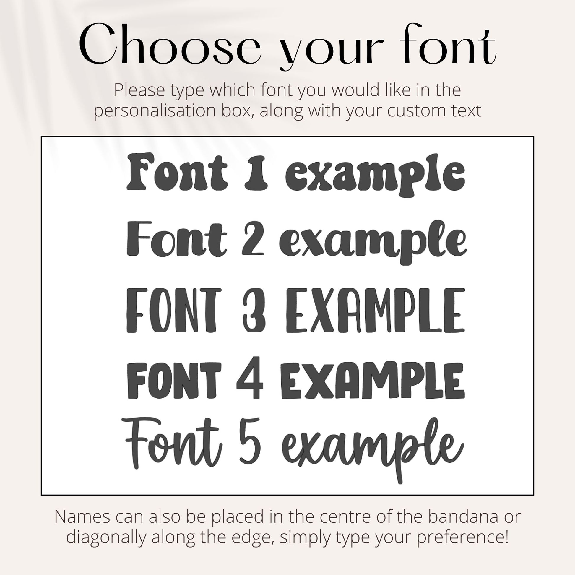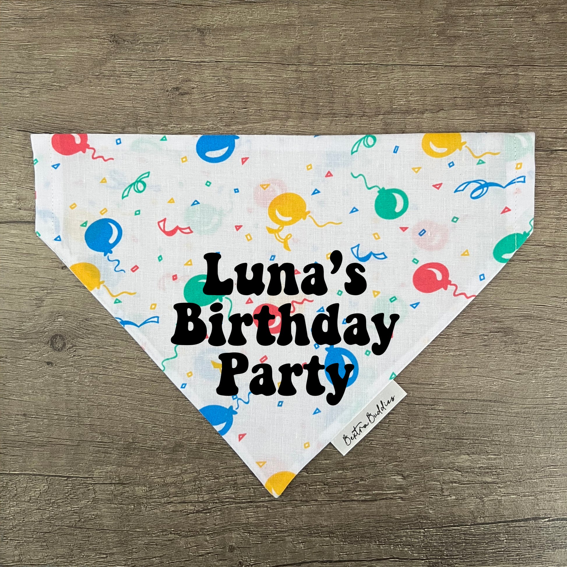 Let's pawty! Personalise this bandana with your chosen text and font. Our bandanas are handmade so design placement will vary on each.