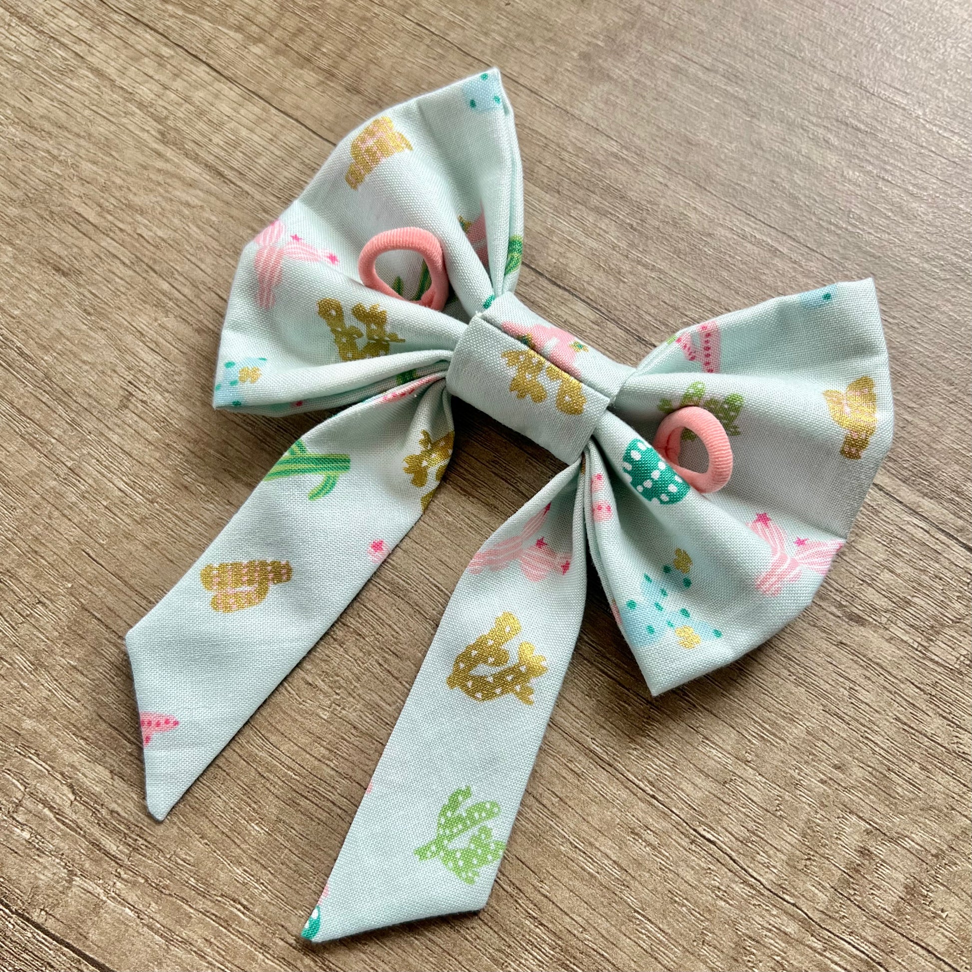 Adorable handmade bow with elastics to slip onto your dog's collar or harness.