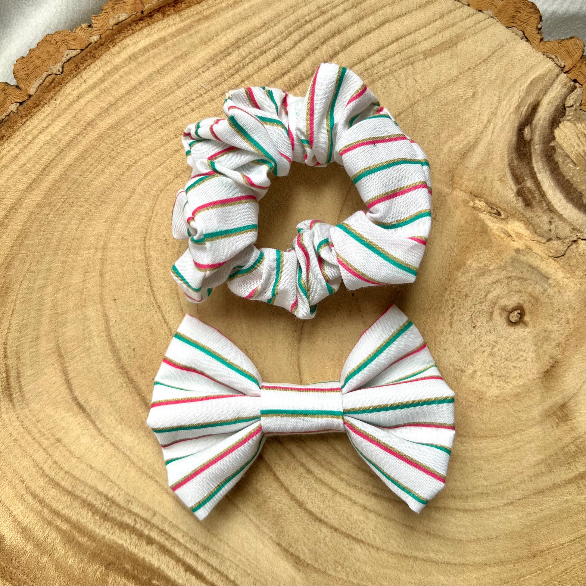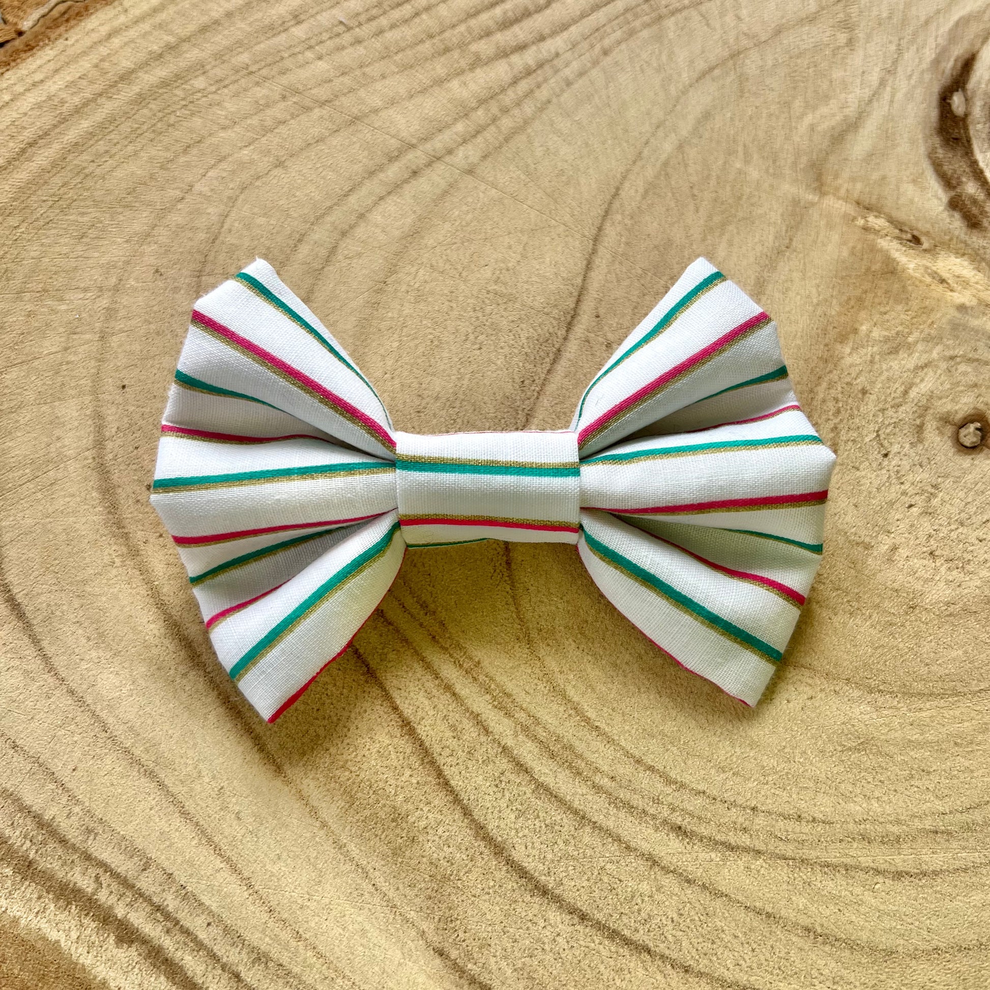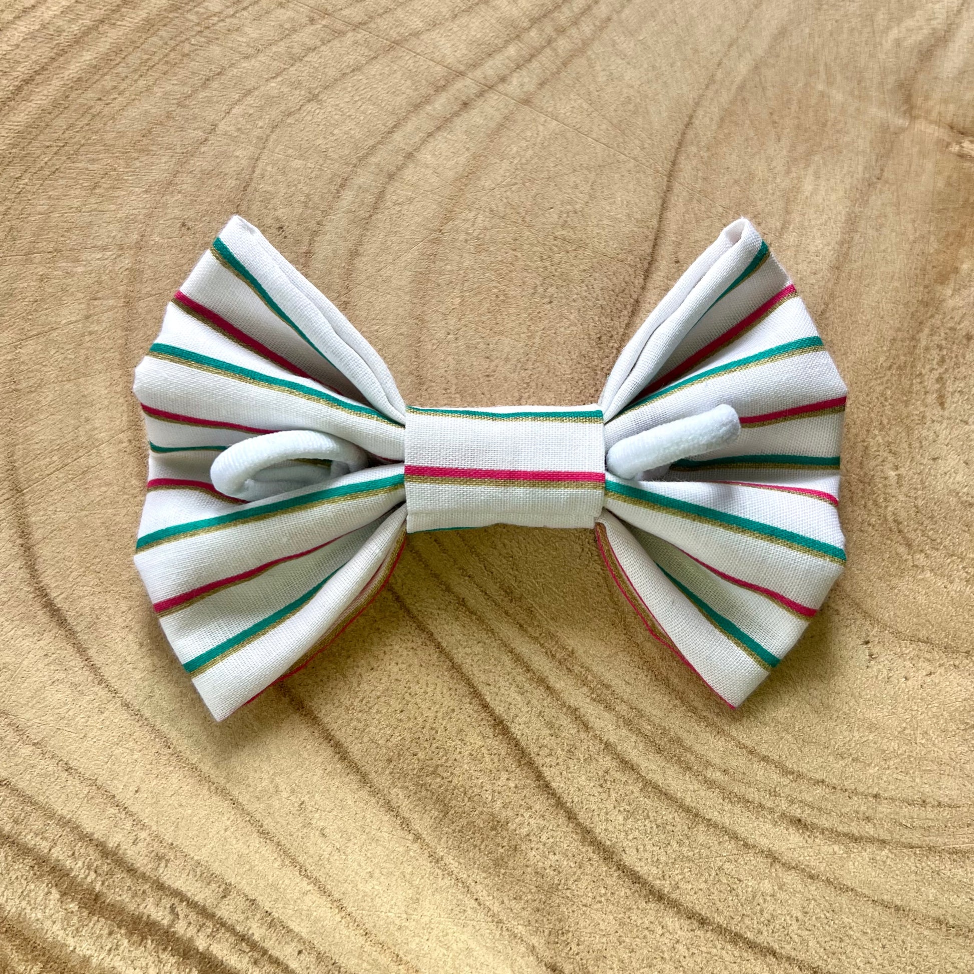 Adorable handmade bow with elastics to slip onto your dog's collar or harness.