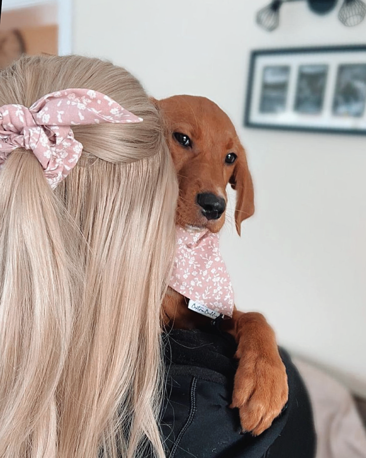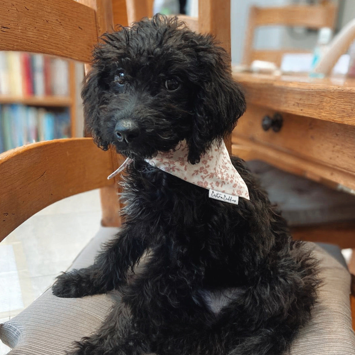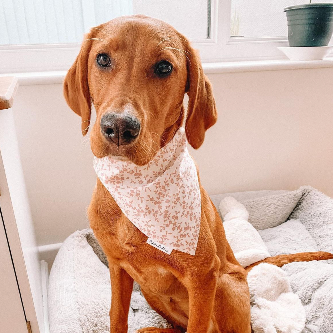 Beautiful white and pink floral bandana. Add your dog's name along the edge in black text for a personal touch.