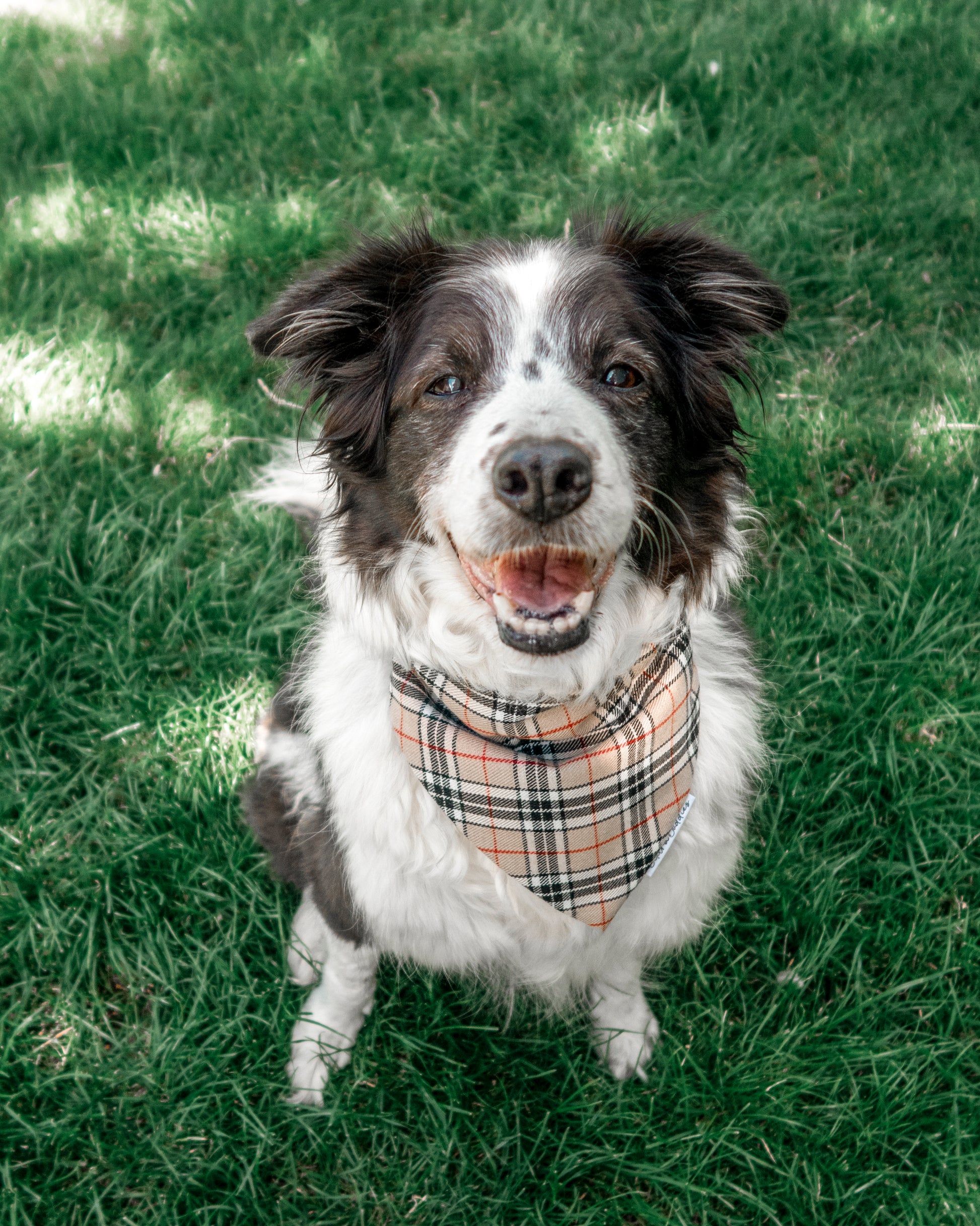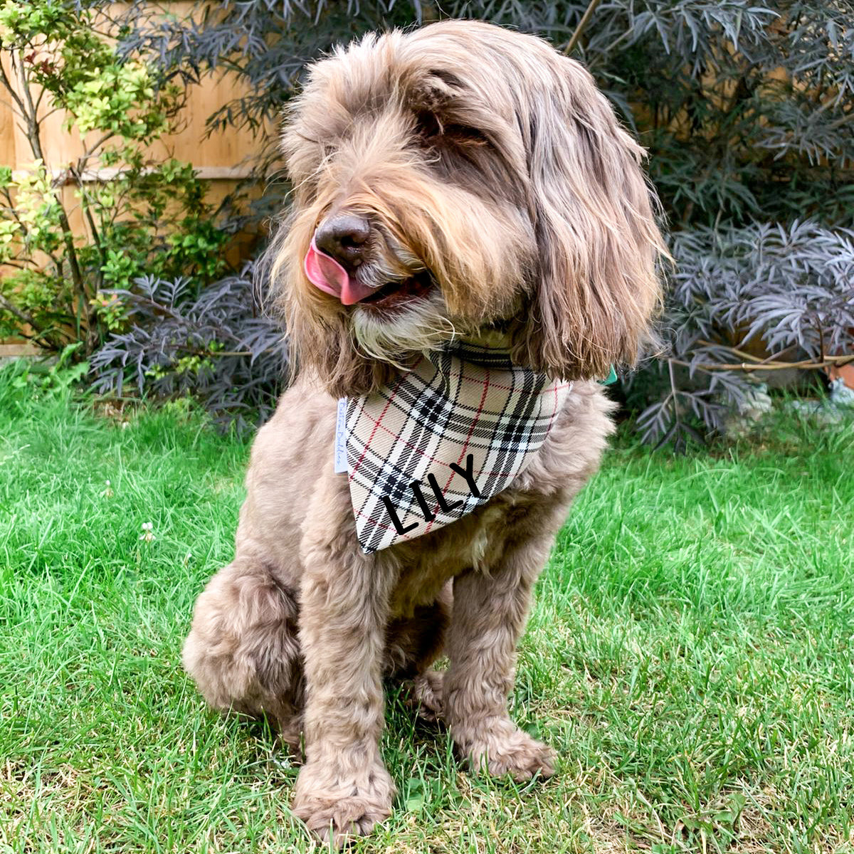 Gorgeous, soft and fashionable tan tartan bandana. Due to lighting and differences in monitors, colours may vary slightly from what appears online. Each bandana is handmade so design placement can vary on each bandana.