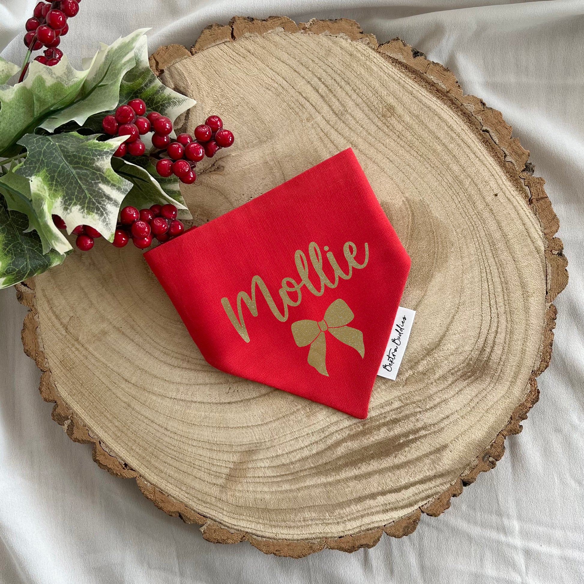 Give your pup a touch of luxury with our Red Dog Bandana featuring a Gold Name and Bow Design. Perfect for special occasions or everyday style, this personalised bandana makes your furry friend look extra adorable while showing off their name in shimmering gold lettering.