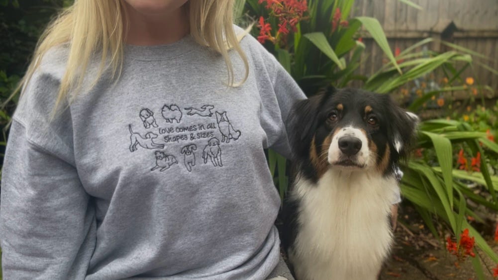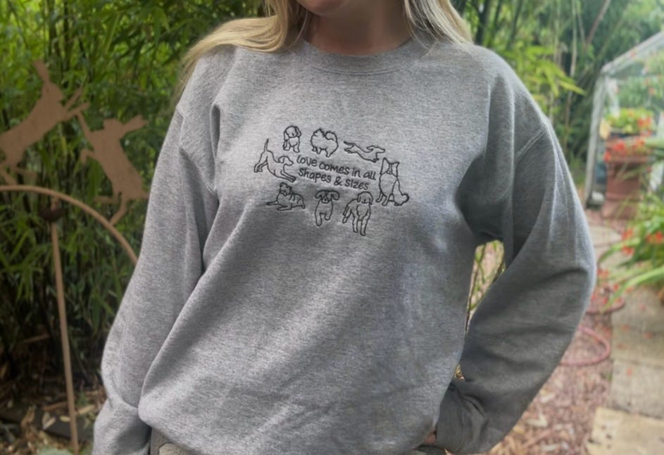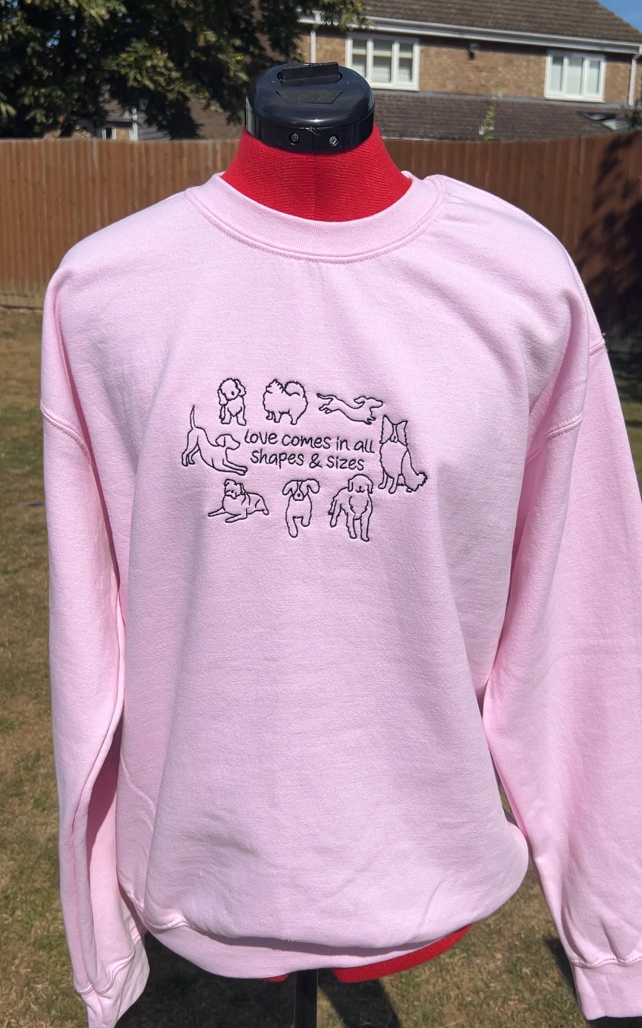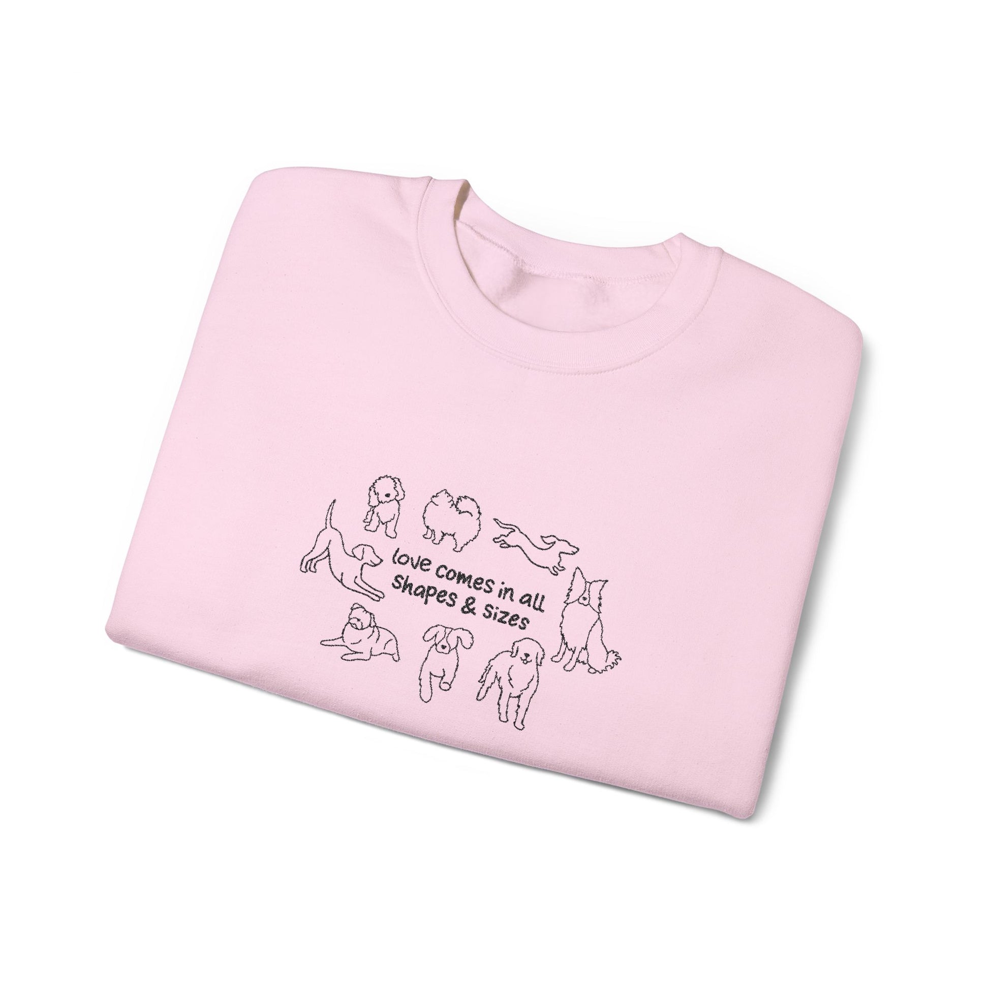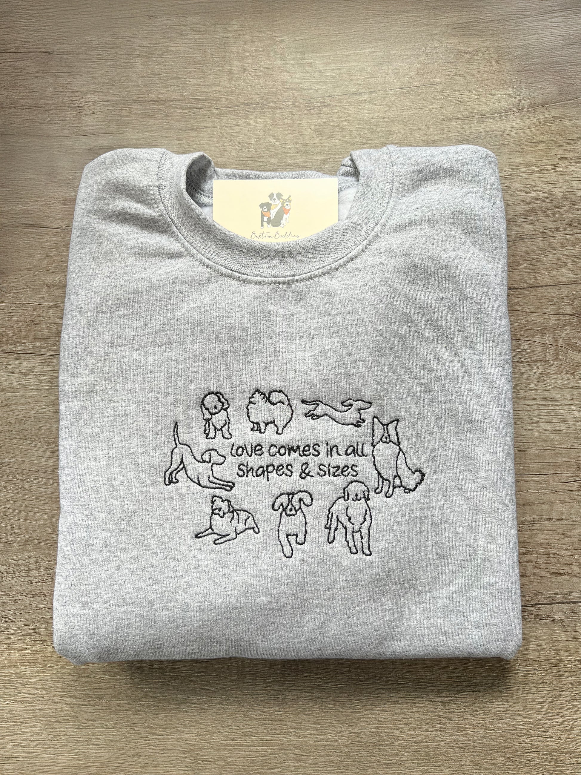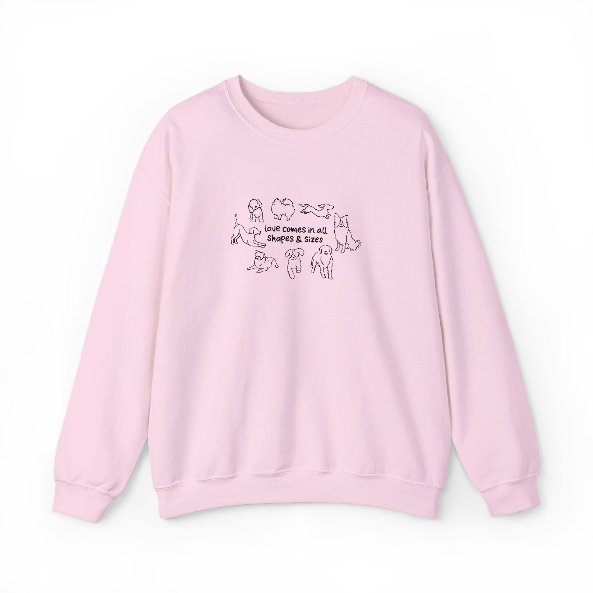 Show your dog-loving spirit with the Love Comes In All Shapes & Sizes Sweatshirt! This cozy jumper features charming embroidery that celebrates our furry friend’s unique silhouettes. Perfect for cuddling up or strutting your pup pride, it’s a playful way to wear your heart on your sleeve, or chest!