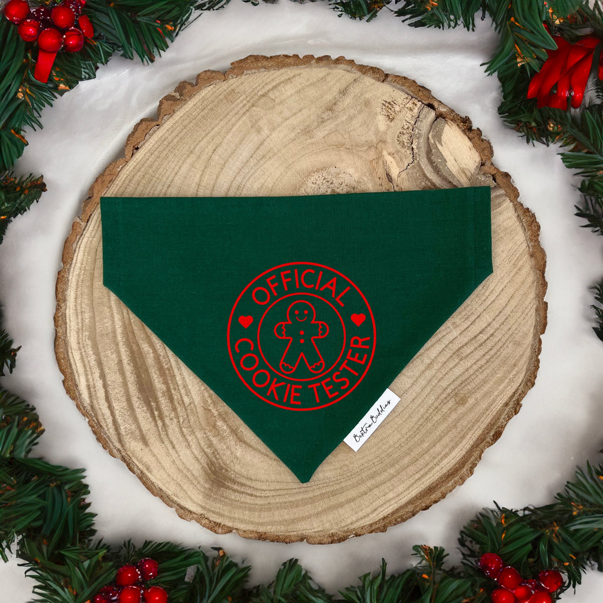 Adorable gingerbread man bandana! Each bandana is handmade so design placement can vary on each bandana. Due to lighting and differences in monitors, colours may vary slightly from what appears online.