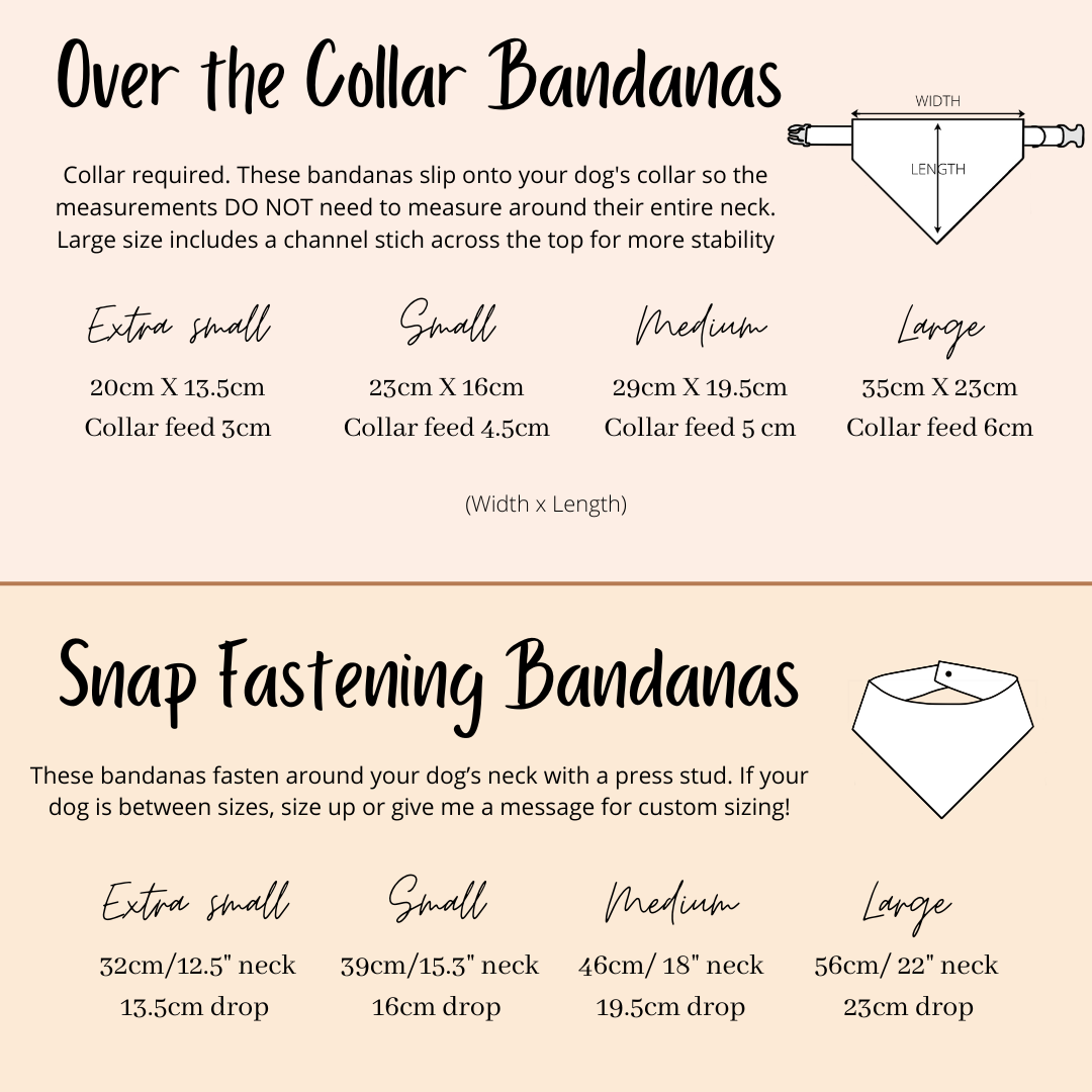 Each bandana is handmade so design placement can vary on each bandana. Due to lighting and differences in monitors, colours may vary slightly from what appears online.